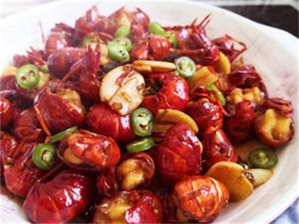 將小龍蝦清水洗泡一個(gè)小時(shí)后掐去頭部,尾部抽掉背筋,用小刷將去頭抽筋的小龍蝦清洗干凈瀝水備用。