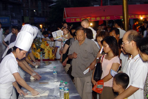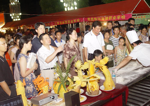 活動現(xiàn)場由新東方烹飪學(xué)院師生聯(lián)合推出的現(xiàn)場雕刻和現(xiàn)場拉面吸引了眾多人們的眼球,學(xué)院展臺上擺滿栩栩如生的雕刻、拼擺。一個普通的南瓜、一個貌似平常的心里美蘿卜,在新東方師生們的手中眨眼間便幻化為花鳥蟲魚,龍飛鳳舞,活靈活現(xiàn)。新東方的展臺成為當(dāng)天職業(yè)教育展示活動中的一大亮點(diǎn)。展臺前圍得水泄不通,很多人只能在外圍看著擁擠的人群急得直跺腳。在展示活動現(xiàn)場人們強(qiáng)烈的要求下,在主辦單位的邀請下,學(xué)子們登上熱力四身的大舞臺,表演“拉面跳繩”的節(jié)目,更是將此次成果展推向了高潮,全場掌聲雷動,叫好聲不絕于耳。展臺現(xiàn)場新東方學(xué)子們的雕刻作品被前來觀看的學(xué)生和家長們一搶而空。更多的人則是無奈地排著長隊(duì),等候著新的雕刻作品出爐。