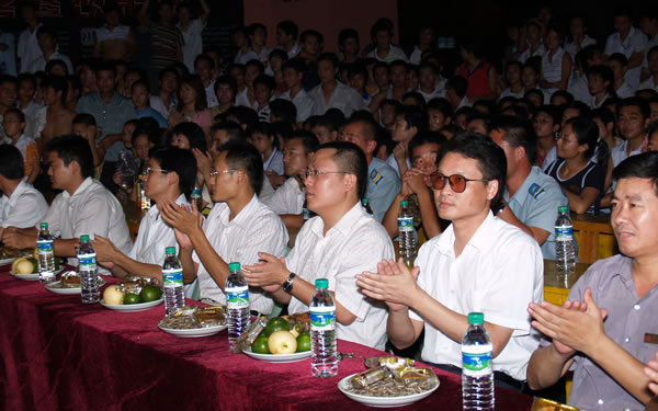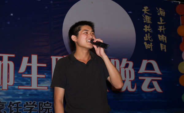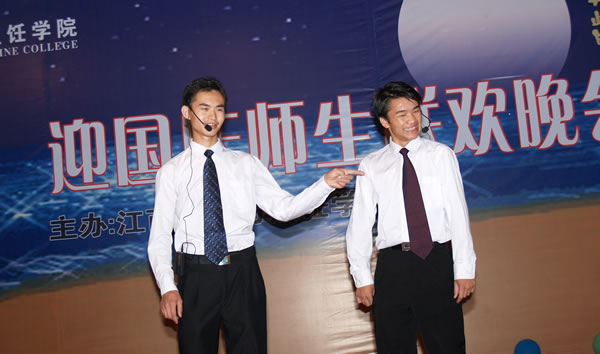 由李延年和袁明兩位同學表演的相聲——《說學逗唱》將晚會推向高潮,感染了現(xiàn)場的每位師生,晚會現(xiàn)場歡笑聲一片。