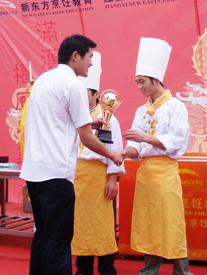 下午4:00,較后一項內(nèi)容——“真味對決”正式開始。參賽各隊必須在一個小時之內(nèi)完成兩道熱菜的制作程序。經(jīng)過60分鐘的緊張制作,6道各具特色的熱菜菜肴端到了評委們的面前。這6道菜肴,無論是獨到的雕刻工夫,還是基礎(chǔ)扎實的刀功,無論是鮮艷的色彩,還是菜肴的飄香,都給人們以強烈的震撼。面對制作精細,內(nèi)涵豐富,做工巧妙,不分上下的作品,五位評委感到評斷的艱難。較終,評委小組根據(jù)菜肴的色、香、味、形以及總體搭配、創(chuàng)新實用、營養(yǎng)價格等指標,評出了本次擂臺賽的擂主。來自江西吉安的朱星星同學(xué)制作的“松鼠戲果”獲得首要名,其本人榮登江西新東方烹飪學(xué)院首屆“新東方”杯烹飪擂臺賽擂主寶座;來自江西龍南的徐文錦同學(xué)制作的“紅湯草魚面”和來自江西東鄉(xiāng)的周豐華同學(xué)制作的“碧綠魚腐”分別獲得第二、三名。