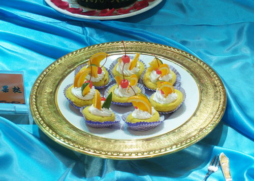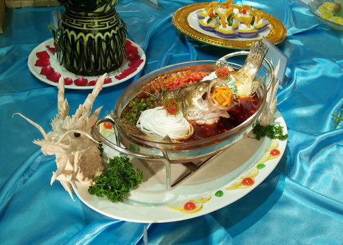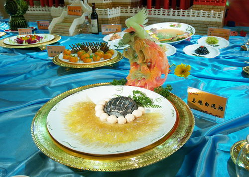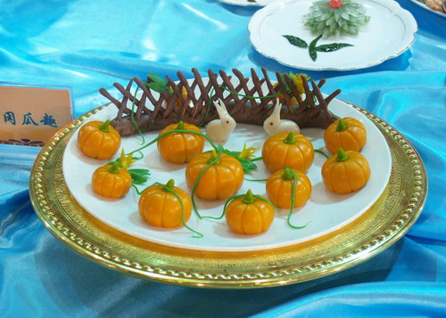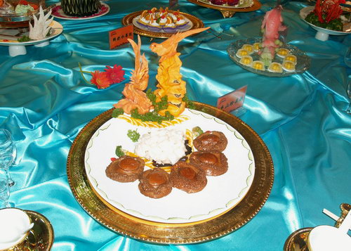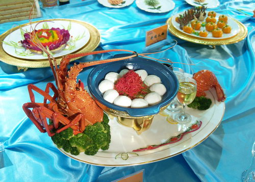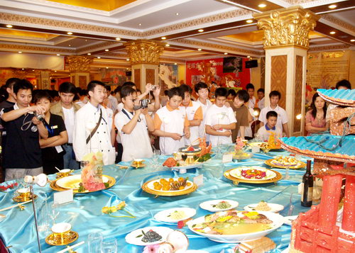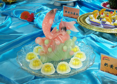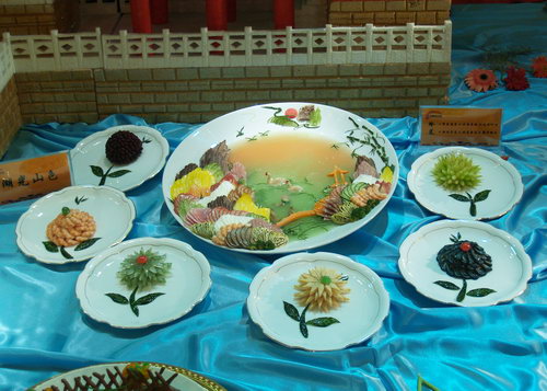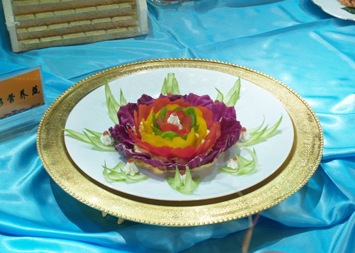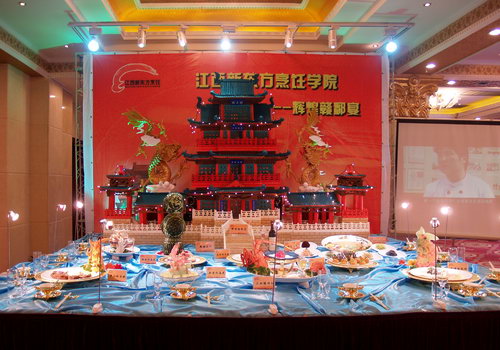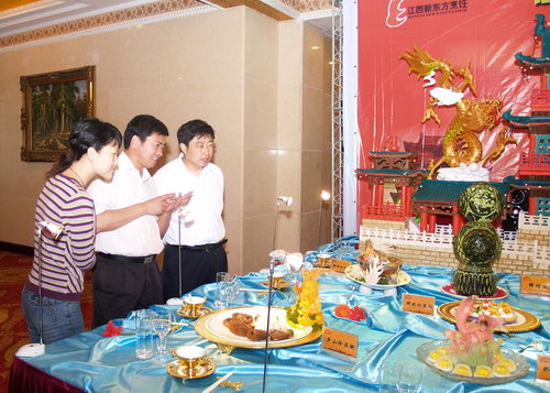 本次參賽的菜肴道道精美,尤其是我們學(xué)院的推出的“輝煌贛鄱宴”令人印象較為深刻!拜x煌贛鄱宴”寓意江西經(jīng)濟的發(fā)展日益崛起,創(chuàng)業(yè)之成果。構(gòu)思巧妙、設(shè)計美觀、選料獨特、技法新穎、突出主題,凸顯了贛菜的創(chuàng)新發(fā)展,繁榮的現(xiàn)在、美好的未來、輝煌的明天。同時也展示了江西兒女“求新思變、開明開放、誠實守信、善謀實干”的精神風(fēng)貌。泡膜背景雕刻藤王閣形象逼真,氣勢宏大、造型絕妙。充分顯示了我院大師精湛的技巧和藝術(shù)想象力,展現(xiàn)了我院的綜合實力。還有那刀工精細的“輝煌瓜雕”,如詩如畫的“湖光山色”,口味鮮純的“三杯錦繡蝦”,山珍與海味燴融交乳的“廬山珍品鮑”,深具養(yǎng)顏美容之功效的“烏雞白鳳翅”,鮮醇香辣的“鄱湖絕味魚”,做法時新的“五彩營養(yǎng)蔬”,造型美觀的“井岡瓜趣”,光澤晶瑩剔透的“奶黃水晶花”,中西結(jié)合的“鮮奶水果撻”,道道精美絕倫,都堪稱絕妙之作。
