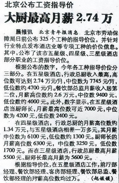 晨報(bào)訊 北京青年報(bào)消息 北京市勞動(dòng)保障局日前公布325個(gè)工種的指導(dǎo)價(jià)位,并針對(duì)行業(yè)特點(diǎn)發(fā)布酒店等專(zhuān)項(xiàng)工種的眾信息。其中,公布了該市五星級(jí)、四星級(jí)、三星級(jí)酒店部分職業(yè)的工資指導(dǎo)價(jià)位。