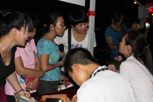 活動接近高潮,越來越多的群眾圍觀表演,紛紛請求老師現(xiàn)場教一個較簡單的花色給大家,并把老師和同學現(xiàn)場雕刻的各式花朵、喜鵲、春意盎然等展品一搶而光。