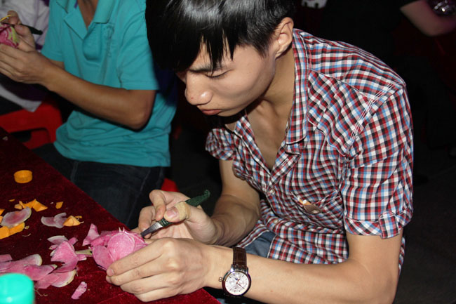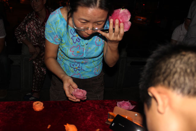 觀眾對學生現(xiàn)場雕刻的花愛不釋手