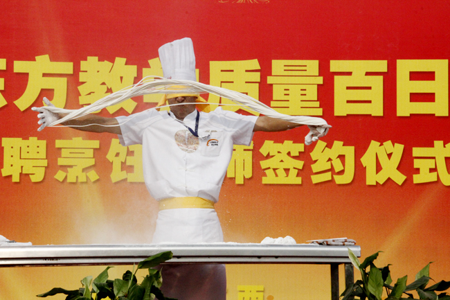 江西新東方烹飪學院教師朱谷生表演蒙眼拉面