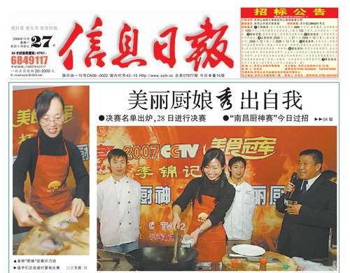 11月28日,2007美味中國烹飪大賽南昌賽區(qū)總決賽在江西新東方烹飪學(xué)院隆重舉行!中央電視臺主持人韓冬,南昌電視臺主持人楊瑞英現(xiàn)場主持。烹飪高手們在這里逐鹿南昌“廚神”!中央電視臺經(jīng)濟(jì)頻道、江西電視臺、信息日報等權(quán)威媒體對現(xiàn)場賽事做了全程報道!