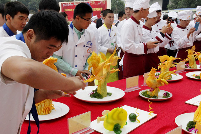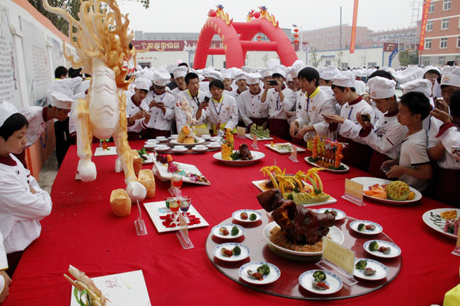 一大早,學(xué)生們就忙開(kāi)了,準(zhǔn)備著熱菜、雕刻、拼盤(pán)、中點(diǎn)、西點(diǎn)、面塑,糖藝,精彩紛呈。學(xué)生入學(xué)以來(lái)學(xué)到了什么?學(xué)的怎么樣?我們似乎能從學(xué)生們充滿(mǎn)自豪的臉上找到了答案。學(xué)生們各個(gè)精神飽滿(mǎn)充滿(mǎn)自信的歡迎校領(lǐng)導(dǎo)的到來(lái)。