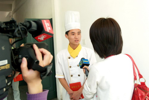 我校獲得冷拼比賽項目一等獎的段志杰同學在接受省內數(shù)家權威媒體采訪