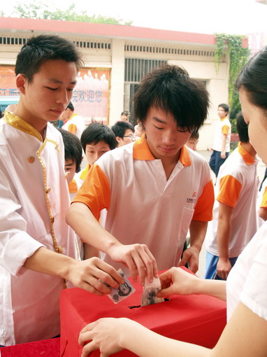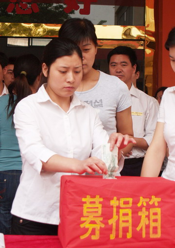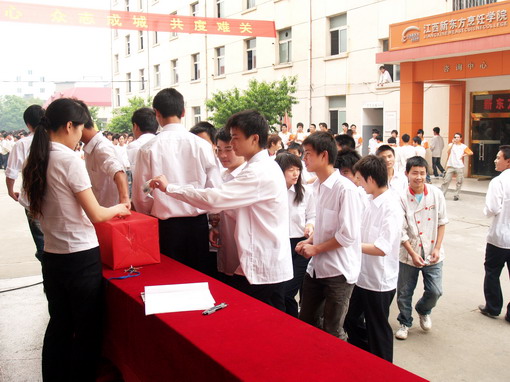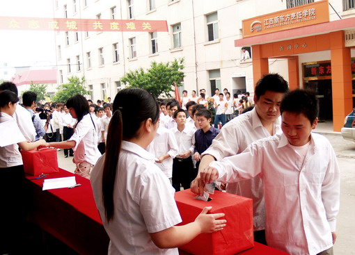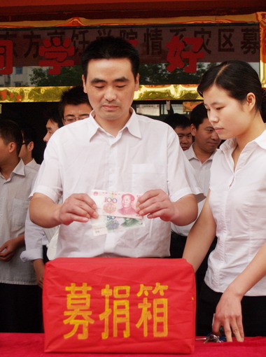 5月15日,江西新東方烹飪學(xué)院“情系災(zāi)區(qū)”募捐儀式在學(xué)院星光大道隆重舉行,操場上排起了長龍,學(xué)院專業(yè)負(fù)責(zé)人張勇主任、教務(wù)部胡應(yīng)東部長、教學(xué)點(diǎn)負(fù)責(zé)人胡孝忠主任等領(lǐng)導(dǎo)領(lǐng)頭走向募捐箱,現(xiàn)場數(shù)千名師生依次向捐助箱內(nèi)獻(xiàn)上了自己的愛心善款。