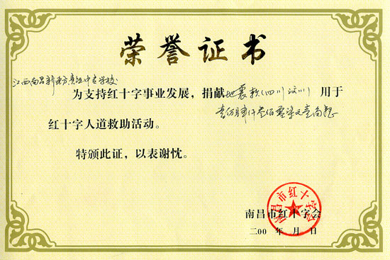 南昌市紅十字協(xié)會(huì)為我院頒發(fā)的榮譽(yù)證書