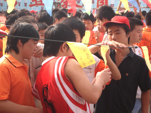 活動組織者將寫有字謎的彩條懸掛在操場臨時(shí)拉起的繩子上;顒舆未開始就吸引了眾多同學(xué)的目光。隨著觀看同學(xué)的增多,活動正式開始,繩子上的彩條很快就被同學(xué)們一搶而光,同學(xué)們紛紛展示出自己的聰明才智,三三倆倆湊在一起討論著謎底。猜出字謎獲得獎(jiǎng)品的同學(xué)也不忘向其他同學(xué)炫耀一番。