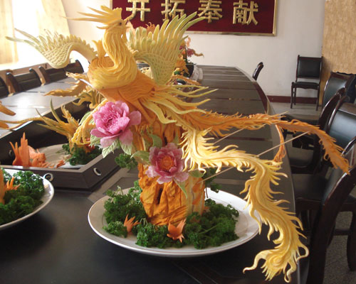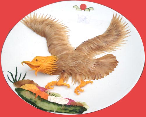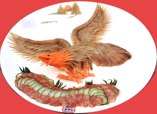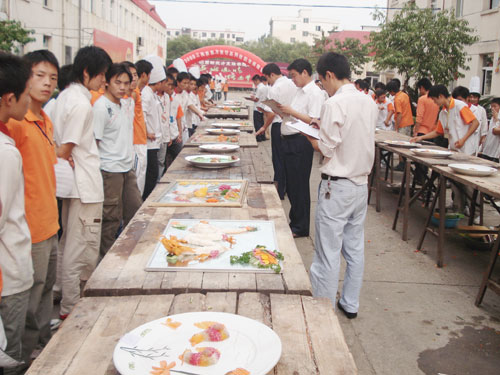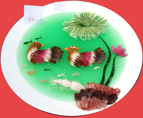 在比賽過程中,參加比賽的40個(gè)選手伴隨著場外陣陣的加油吶喊聲開始了他們的拼盤大比拼,他們需根據(jù)主辦方提供的胡蘿卜、黃瓜、西紅柿等材料制作出色、香、味、形、養(yǎng)為一體的拼盤,并為其取一個(gè)名字。選手們細(xì)心的運(yùn)用了雕、切、剝、削、拼等技巧,原本很普通的原始材料變成了精致可人的拼盤。