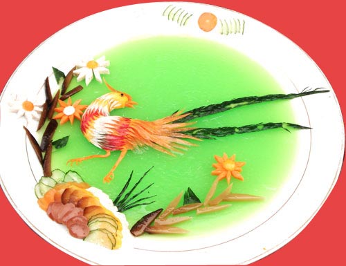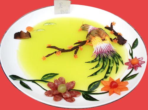 較后,由劉大鑫制作的《錦上添花》以其飽滿的構(gòu)圖、完美的色彩搭配、精致的刀工、便于飲食和豐富的寓意獲得了本次冷拼大賽的一等獎(jiǎng)。