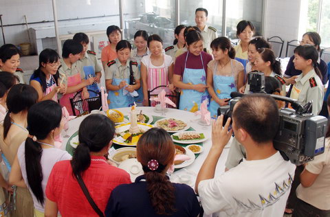 在授課現(xiàn)場,涂教授和王梁生大師設(shè)計了特別的教學(xué)方法,以理論融入實踐,現(xiàn)場演示每一道菜的烹制,邊烹制邊講解,不放過每個細(xì)節(jié),直到在場的每個學(xué)員都弄清,都能弄懂,講完所有菜后,并讓每個軍嫂上場親自烹制一個菜,由涂教授親自點評與指點,以檢測學(xué)習(xí)效果。