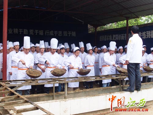 學員用沙粒來練習炒菜翻鍋技術(江西網(wǎng)記者 雷衛(wèi) 報道)