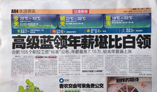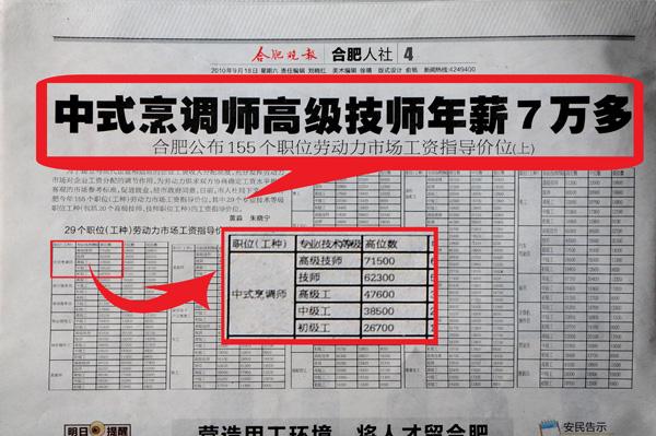 據(jù)合肥晚報、江淮晨報、安徽商報、市場星報訊較新消息,近日合肥人社局發(fā)布155個職業(yè)(工種)的勞動力市場工資指導(dǎo)價位,數(shù)據(jù)顯示很多藍領(lǐng)的收入較去年有所增長,而高技能人才的收入更是相當(dāng)可觀。其中,中式烹調(diào)師年薪愈7萬位居榜首,堪比白領(lǐng)。